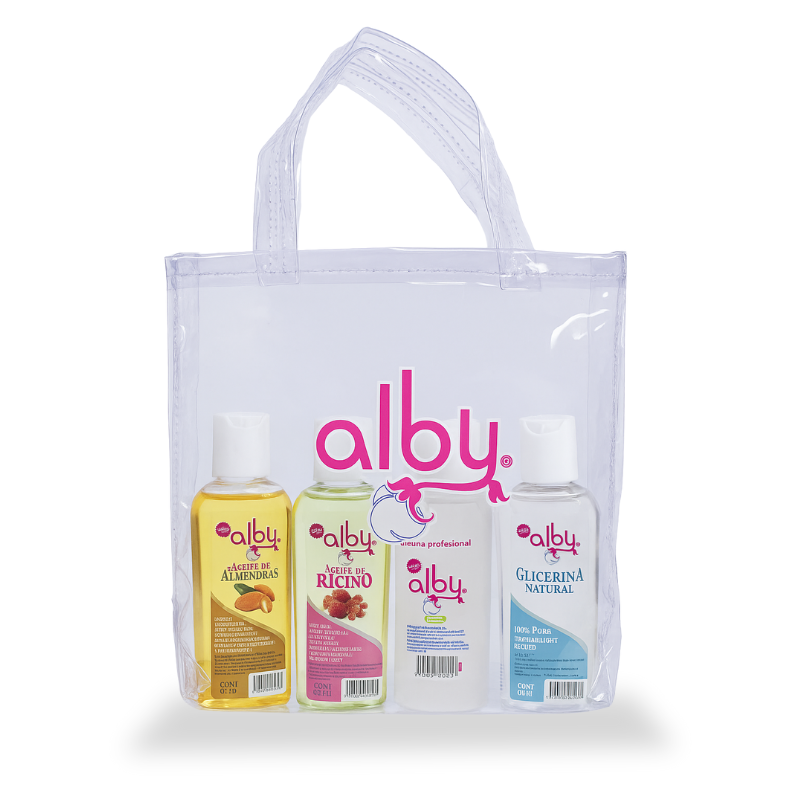 La cosmetiquera Alby es un práctico kit pensado para el cuidado diario de tu piel, cabello y bienestar personal. Su presentación incluye una variedad de productos esenciales como aceite de oliva, aceite de almendras, aceite de coco, aceite de ricino, glicerina, gel antibacterial, acetona, repelente de mosquitos y almohadillas de algodón desmaquillantes, todo en envases cómodos de 60 a 65 ml. Además, viene en una bolsita transparente ideal para llevar de viaje o regalar.